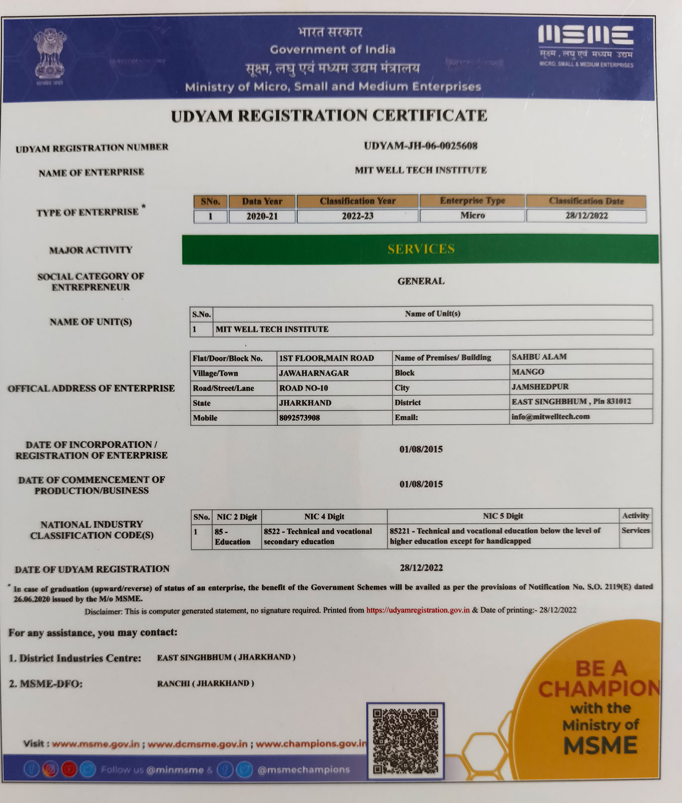 M I T Well Tech Institute envisages a society where every youth has a respected job by providing them quality technical education. This way, we can ensure more economical equality in the society. We believe, everybody has talent, we just want to bring it to the surface.
